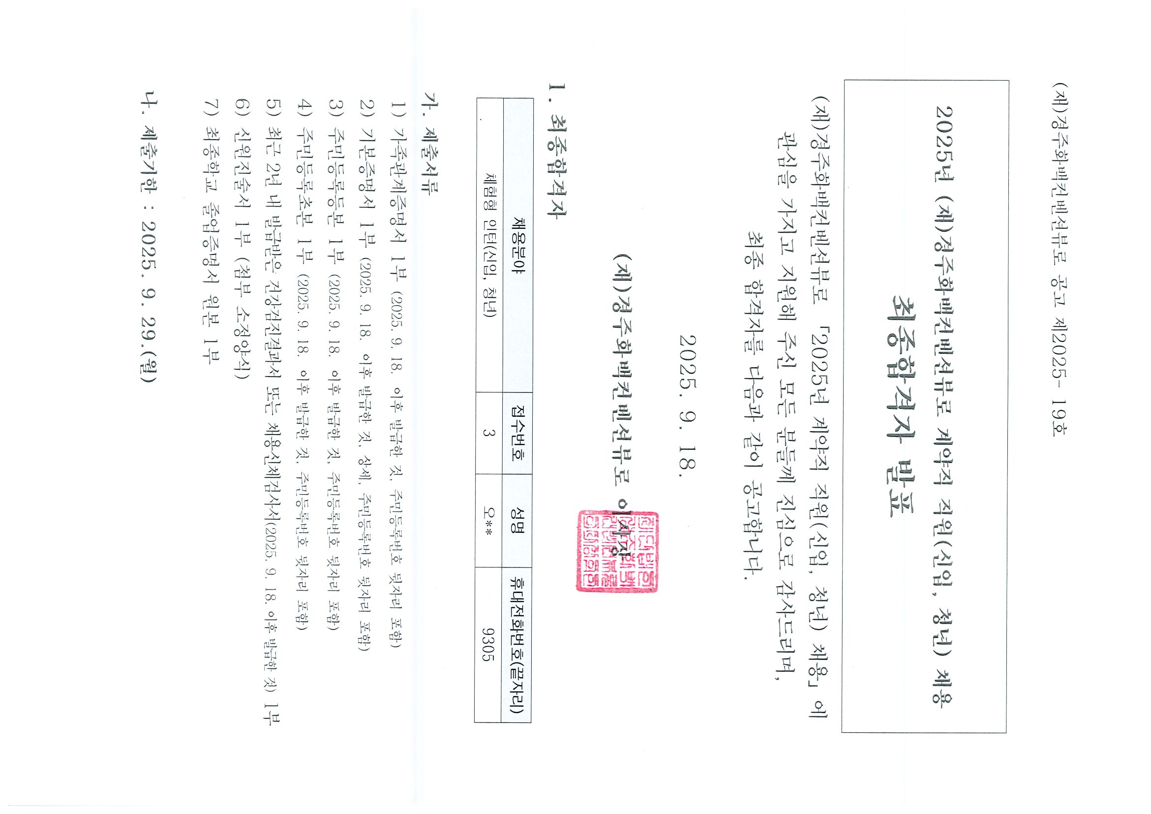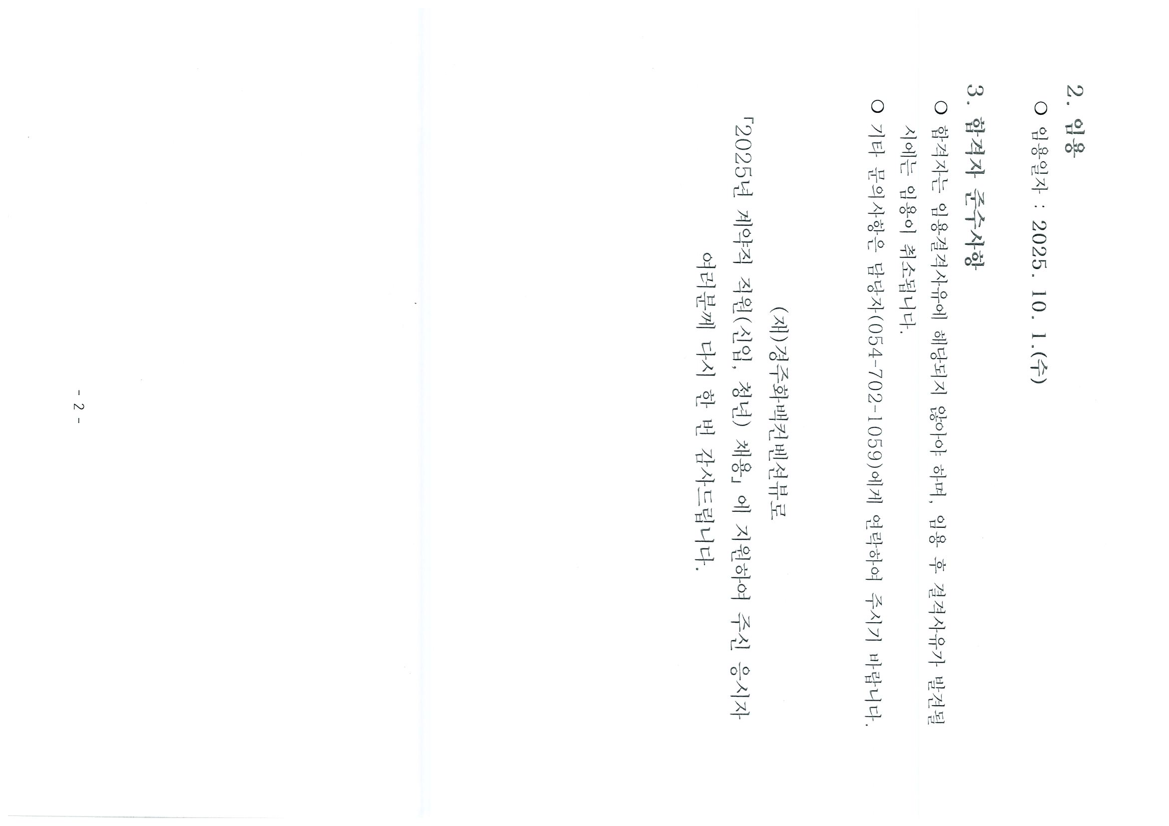 | 제목 | ( 재)경주화백컨벤션뷰로 계약직 직원(신입, 청년) 채용 최종합격자 발표 | 작성일 | 2025-09-18 |