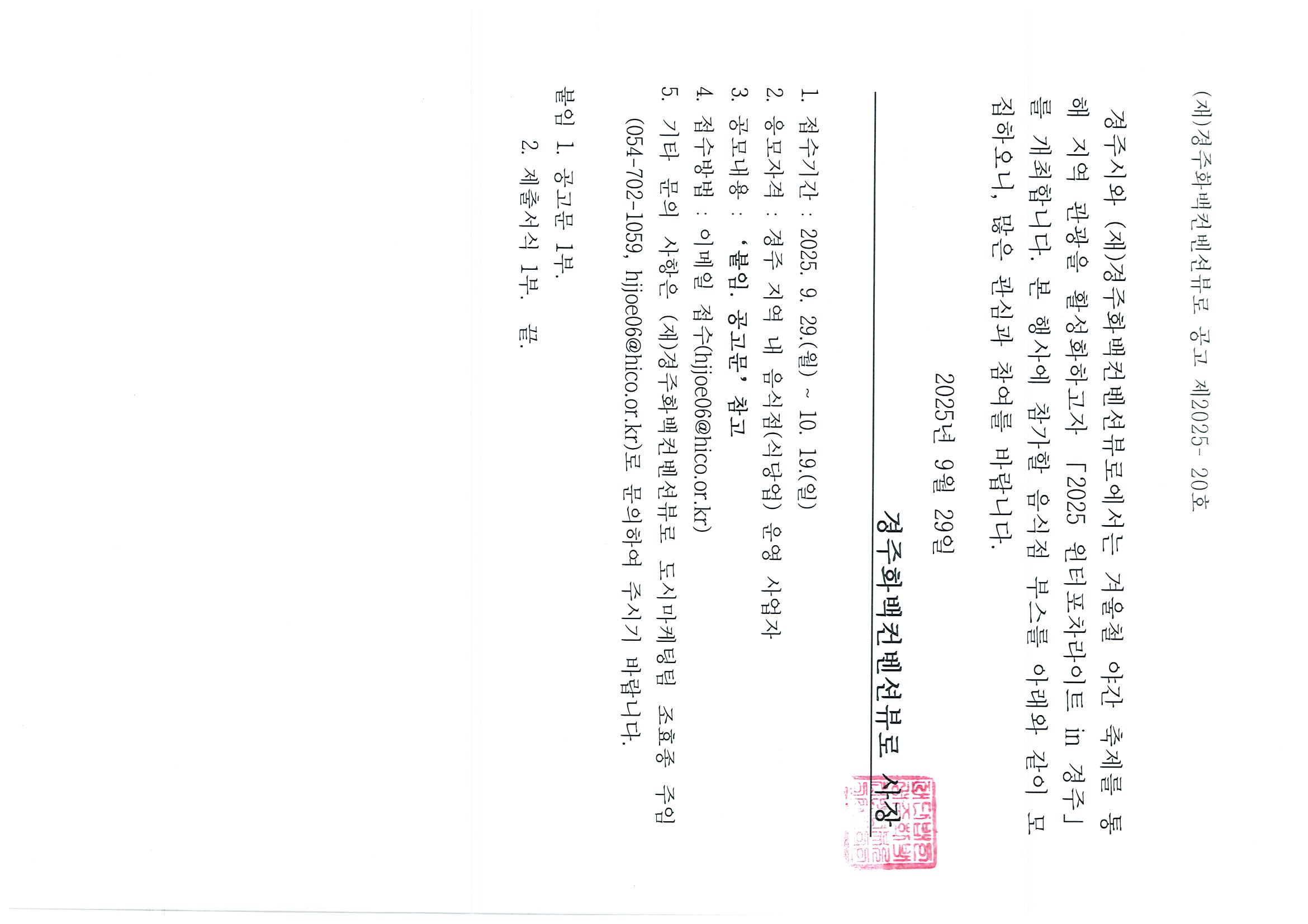 | 다음글 로컬브랜드페어 2025 '테이스티 경주' 공식 파트너샵 모집 공고 (~10월 30일까지 신청마감) | |||